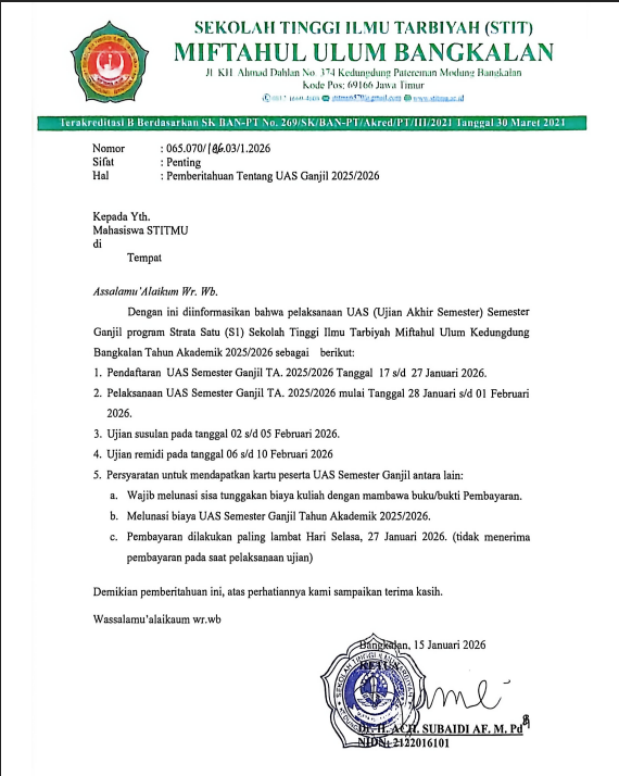 Read More Pengumuman UAS Semester Ganjil TA 2025/2026 Bangkalan 28 JAN 2026 s/d 01 FEB 2026 09:00 - 13:00 WIB