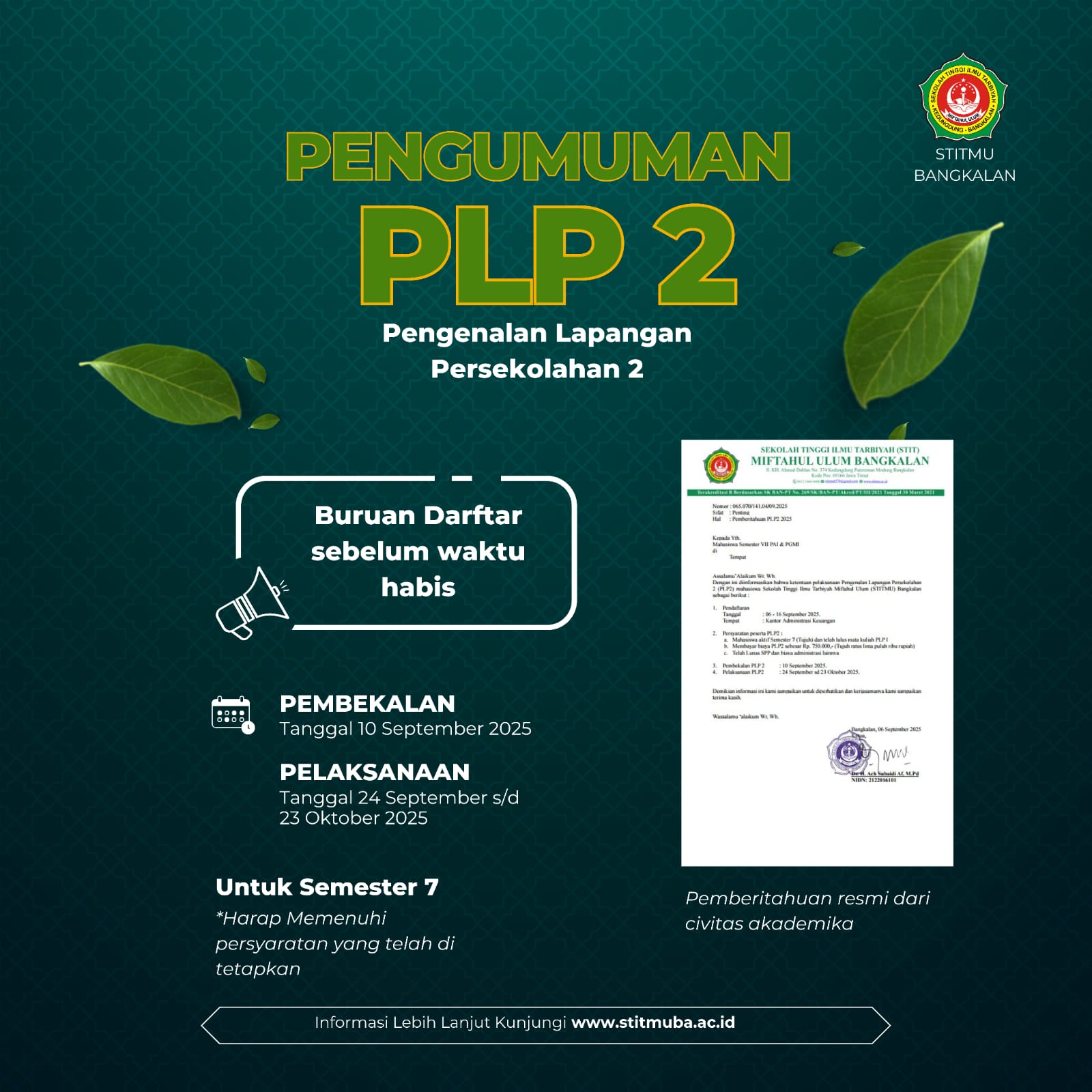 Read More Pengenalan Lapangan Persekolahan (PLP) 2 STITMU Bangkalan 24 SEP 2025 s/d 23 OKT 2025 01:03 - 01:03 WIB